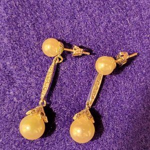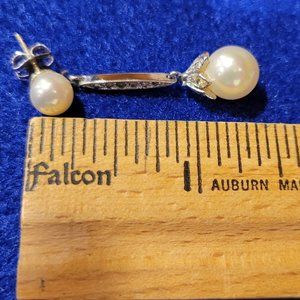 Vintage silver tone pearl drop earrings with simulated diamonds