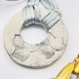 Ivy Embossed Ceramic Pendant Necklace Grey Satin Cord Boho Festival Party Hippie