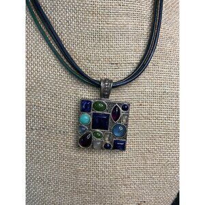 Silver Tone Pendant with Blue Purple Green Rhinestones Corded Lobster Claw with