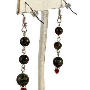 Silver Tone Pierced French Wire Green Stone & Red Crystal Earrings.