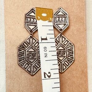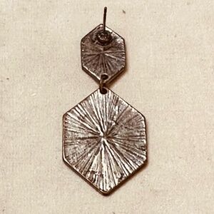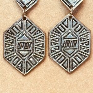Silver tone post earrings. Tribal, rhombus-shaped hexagon, geometric, 2-part connected post dangle earrings. No markings, stamps or signatures. Vintage. EUC.