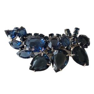 Add an extravagant and exceptionally designed accessory to your outfit. This stunning pin brooch is an impressive dimensional composition featuring an exquisite array of round, marquis, and teardrop-shaped rhinestones brilliantly cut and faceted fancy individually prong set in clusters throughout the curved silver tone base metal setting. These rhinestone components are gorgeous and amazingly sparkle under the light. It measures approximately 2.7 inches in length. This pin is secured with a locking pin on the reverse. This fantastic piece will add a touch of vintage glamour to any outfit. Don't miss adding this very collectible piece to your jewelry box.