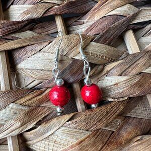 Silver Tone Red Marbled Ball Earrings Dangle Boho
