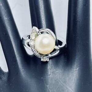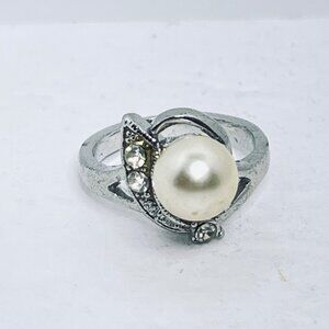 Silver Tone Rhinestone & Faux Pearl Statement Ring Size 6.25 (R429)