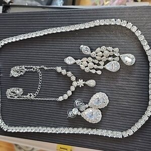 Silver Tone: 2 rhinestone necklaces, 2 pairs of pierced rhinestone drop earrings excellent condition, vibrant rhinestones