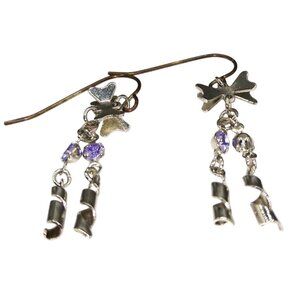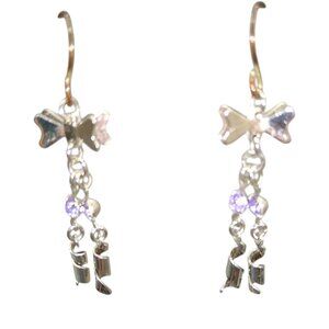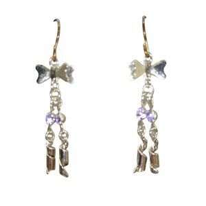 Silver Tone Ribbons and Bows Earrings, Vintage Dangle Drop Baby Blue Crystals with Bow and Curling Ribbons