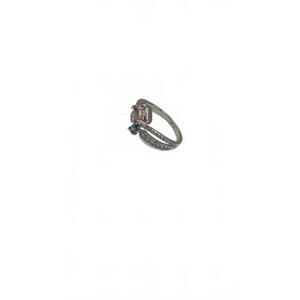 Elegant silver ring featuring a central pink gemstone and a smaller blue gemstone. Band is adorned with small clear stones for added sparkle. Perfect for everyday wear or special occasions. Comfortable fit with a unique dual-stone design.