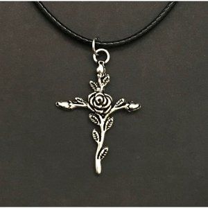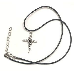 Silver Tone Rose Cross Black Waxed Cord Necklace