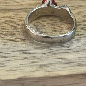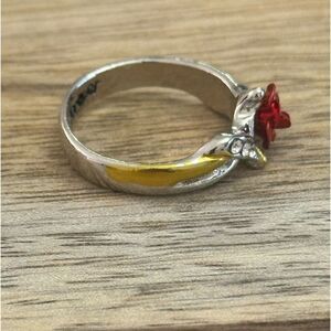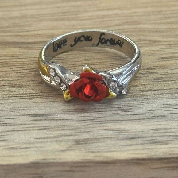 Silver Tone Rose Ring with Gold Tone Accents Size 7. Very good preloved condition. Inside band is scripted with “love you forever”.