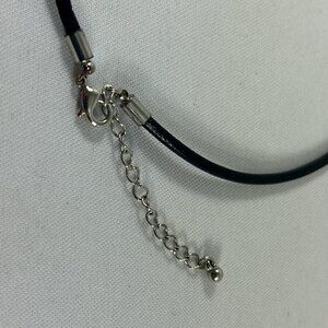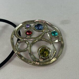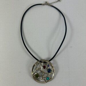 Silver Tone Round Rhinestones Pendant Corded Necklace Open Work Geometric in good preowned condition. Necklace measures 16-18".