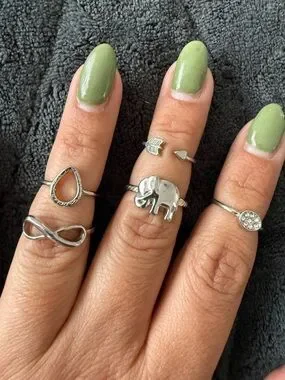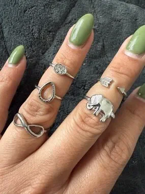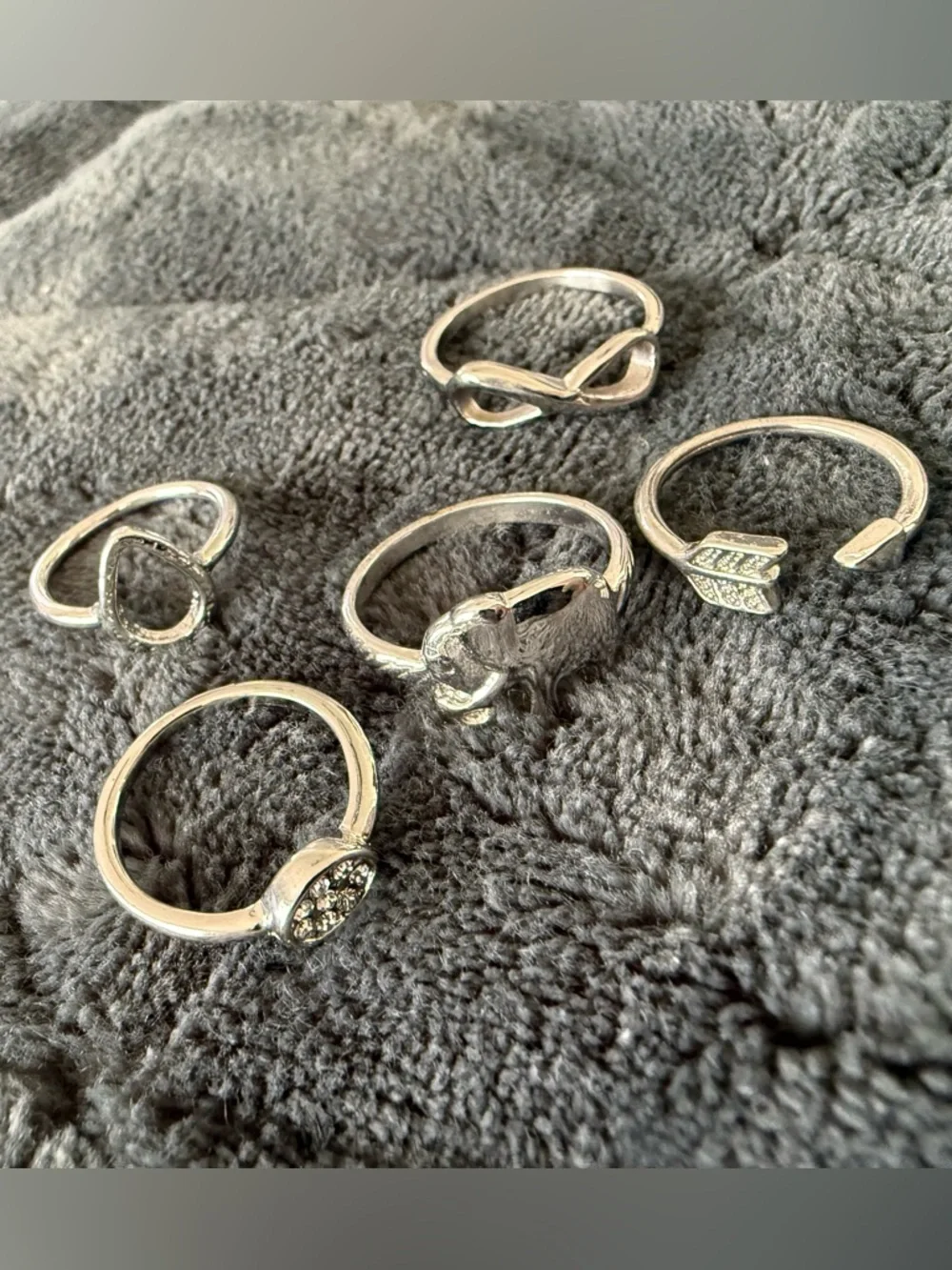 Like New! Set includes five rings! Infinity sign, open arrow, elephant, water drop shape and circular crystal rings!