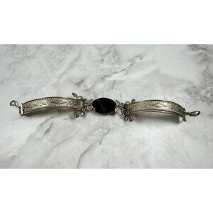 Silver Tone Stamped and Wire Wrapped Bracelet with Black Stone - Unique - 7"