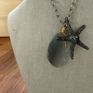 Silver Tone Starfish Charm Blue Gold Geode Style Pendant Long Beachy Necklace