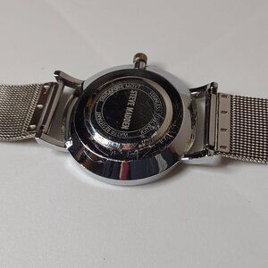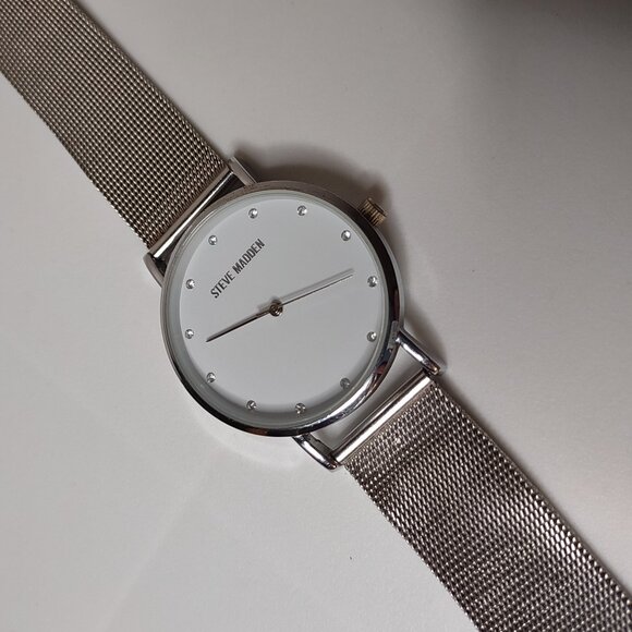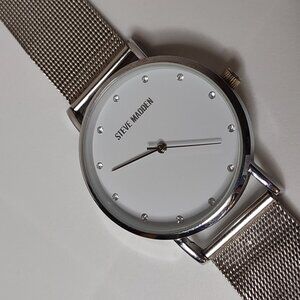 Silver Tone Steve Madden Watch With White Dial. Has A Fair Amount Of Scratching On The Back. Watch Works And Keeps Time. Check Out My Closet For Other Great Items!!! Thank You For Considering Making A Purchase.