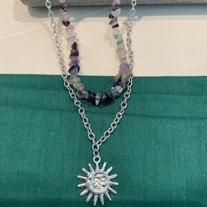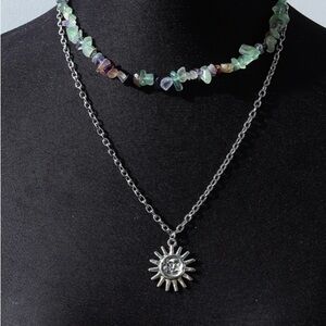 Silver Tone Sun Necklace & Multi Color Stone Beaded Necklace