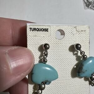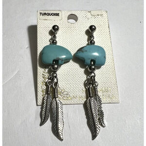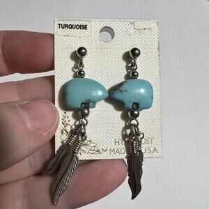 Silver Tone Turquoise Bear Bead and Dangle Feather Earrings Hypoallergenic Post