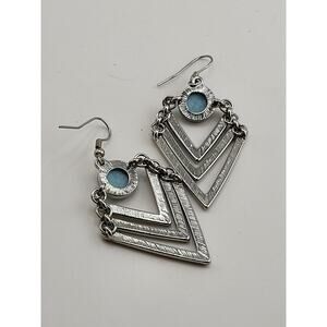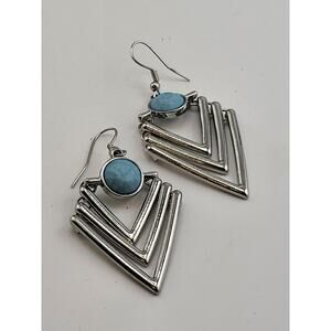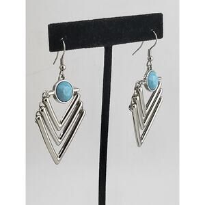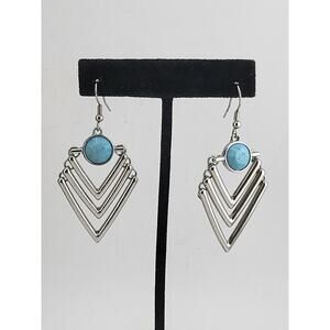 A stylish pair of geometric drop earrings featuring layered silver tone V-shaped frames paired with a round turquoise style cabochon at the top. The design blends modern boho fashion with a retro inspired silhouette, giving these earrings great movement and eye catching shine. Lightweight yet bold, perfect for casual outfits or statement accessorizing.