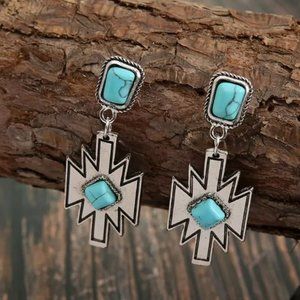 Silver Tone Western Aztec Faux Turquoise Stone Earrings