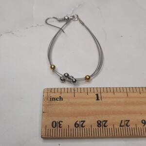 Teardrop shaped dangle earrings made of fine wire with tiny silver and gold beads.