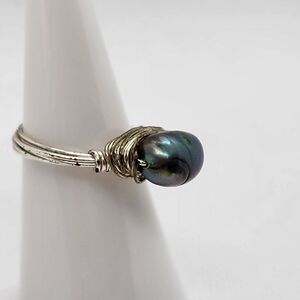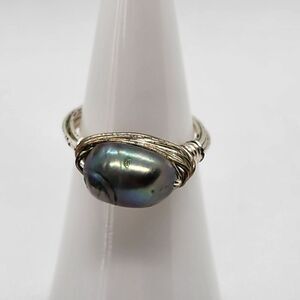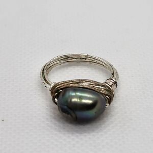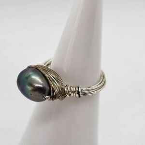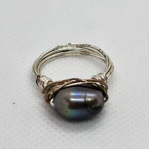 Silver tone wire wrapped ring with a genuine tahitian button pearl.