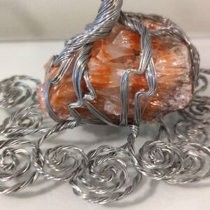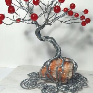 Silver tone wire wrapped tree with a genuine Red Banded Calcite base and red berry leaves. The berries may or may not be glass.