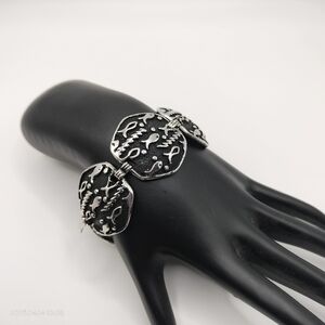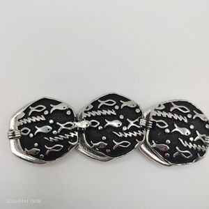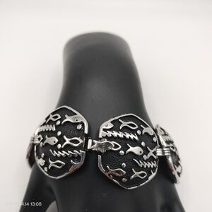 Elegant bracelet featuring a silver fish motif on a black background. Perfect for adding a unique touch to any outfit.