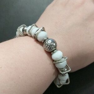 Silver Tone and White Crystal Beaded Stretchy Elastic Statement Bracelet. Stretchy elastic so should fit most people.
