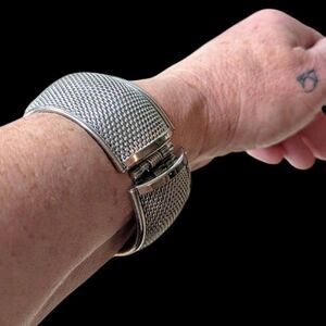 Vintage silvertone mesh hinged bangle bracelet in very good used condition. The only apparent wear is a little tarnish on the inside, see last pic. Bright, textured, easy to wear and layer.
