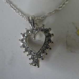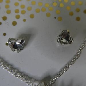 On damaged card, beautiful open heart rhinestone pendant on chain and stud heart rhinestone earrings. Unknown metal content.