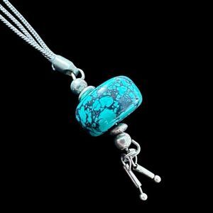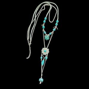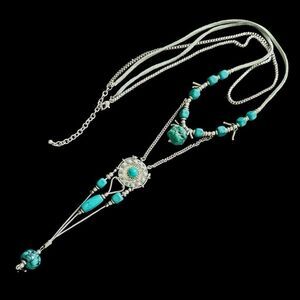 Long necklace features a teardrop-shaped turquoise pendants with a tassel design, set in silver-plated brass. The necklace is made of blue leather rawhide and has a fringe style, perfect for Western, Bohemian, or Retro-themed occasions. It has a lobster claw closure and an adjustable approx. 16-inch rawhide leather rope and smaller metal chain.
