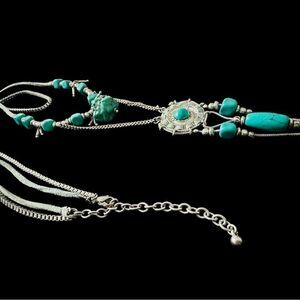 Silver Toned Faux Turquoise Stone Necklace Western Boho Leather Rawhide