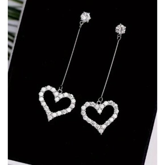 Silver Toned Heart Drop Earrings With Crystal Rhinestones