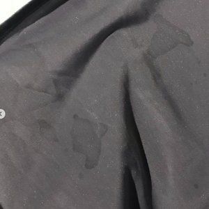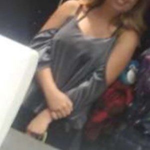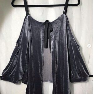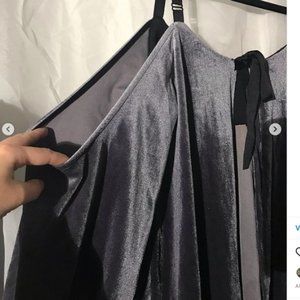 Sparkly grey top with open shoulders and an open back. The ribbon can be /tied/untied to your preference. Has stains on the inside from laundry detergent, not visible when worn.