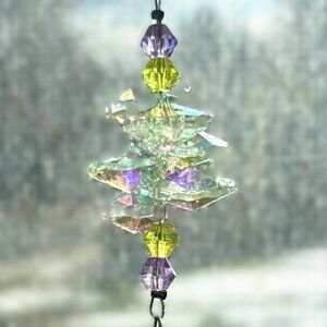 Iridescent, purple and yellow faceted glass crystals adorn this suncatcher. The crystals catch the sunlight and create a mesmerizing display of colors that dance across your walls. Imagine the sunlight streaming through your window, illuminating your room with a kaleidoscope of colors. It's perfect for any room in your home, whether you hang it in your living room, bedroom, or even your office.