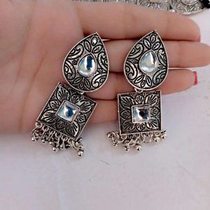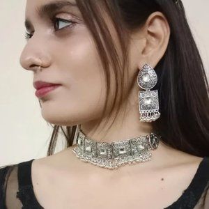 This beautiful work of art has been adorned by a well-known South Asian craftsperson to enhance your sense of style.The metal used to create this Picturesque jewelry set is of very high caliber, and the cleverly chosen mirror chunks and beads serve as the masterpiece's displays. This striking pair of silver jewelry is ornamented with squares of silver material that are patterned, and each square supports a piece of mirror. Their inventiveness isn't finished yet, as the same pattern with mirror is also used on the earrings. This pair of silver oxidized neckpiece jewelry is well worth the price and adds to your personal style. Grab this item as so