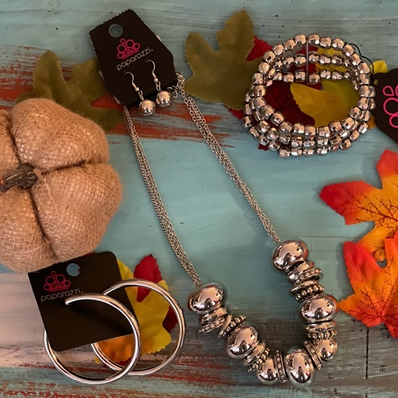Beautiful silver necklace set includes stretch bracelet and hoop earrings.