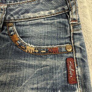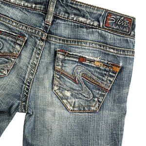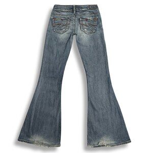 Silver Tuesday 22 Jeans Womens 25 Low Rise Y2K Flare Blue Distressed Embroidered Stretch Denim 28x31