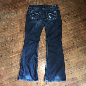 Silver Dark wash western boot cut jeans. In good condition. Approximately 28 inches across the waist, 29 inch inseam. 7.5 inch rise. From a pet and smoke free house. Open to reasonable offers. Happy to bundle!