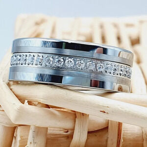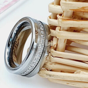 "Silver Tungsten Wedding Ring With White CZ Inlay, GALTUN777