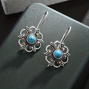 Vintage Style Elegant Turquoise Flower shaped Silvertone Dangle Drop Earrings antique retro style Dainty