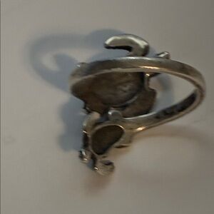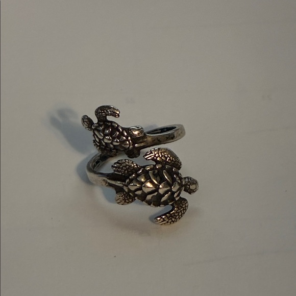 Charming silver ring featuring two turtles. Perfect for ocean lovers. Adjustable