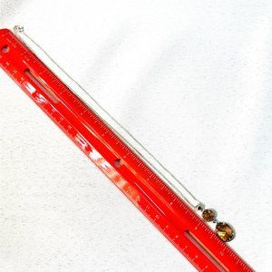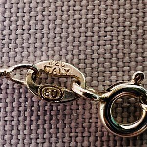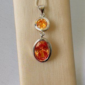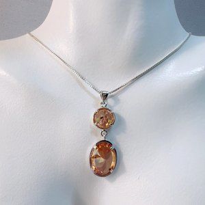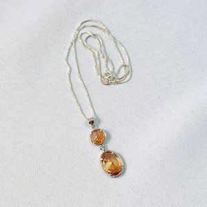 Stunning Citrine color faceted gems (untested) set in sterling silver round bands with the bail marked 925. The tip of both stones are deeply faceted and comes to a point. I can’t decide which side of the pendant is the right way to wear it. The pointy side out or flat side of the stones. Both ways look amazing. The clasp is marked 925 SU (Sterling Unlimited) Italy.