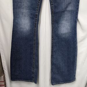 These jeans are in gently used condition. They are a medium weight stretchy denim. Light wear between thighs. Extensive wear on heels. Please see photos for details.