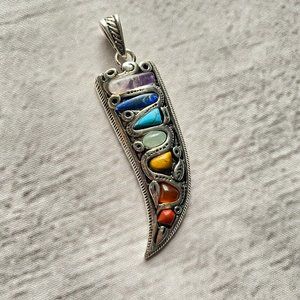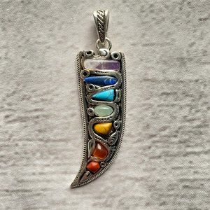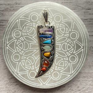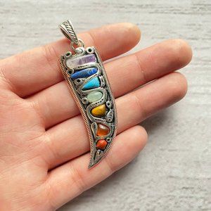 A handmade silver wand pendant, featuring 7 chakra natural gemstones. This is a unique piece that can be worn for protection, meditation & energy healing.
