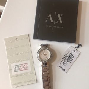Sleek silver watch with crystals on face.