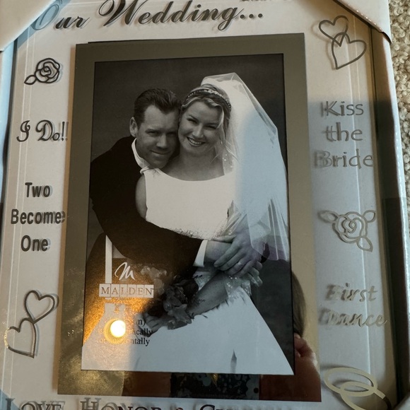 Elegant silver photo frame perfect for wedding memories. Features romantic engravings to cherish your special day.