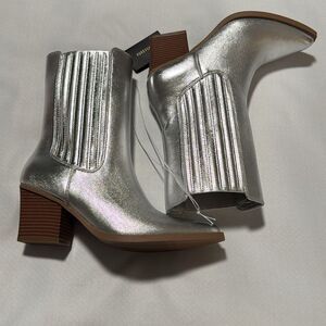 These are new with tags. The heel is 3 inches. The material is all man made. These are pointy toe. The circumference is 11 inches around and is stretch uppers.