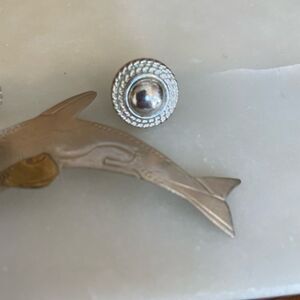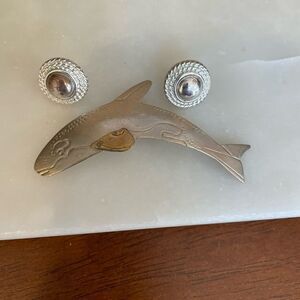 My mom had a lot of jewelry! I’m not sure if the whale is Sterling but appears to be?! It’s not marked. I do know it’s old. The silver tone earrings are beautiful, most likely not silver. Really nice set! The whale is thin not thick!
