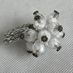 Silver White Beaded Flower Ring Adjustable One Size Fits Any Jewelry