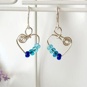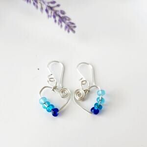 These delicate wire-wrapped beaded earrings are handcrafted with care, featuring silver-plated wire, tarnish-resistant, and aquamarine glass Czech seed beads.